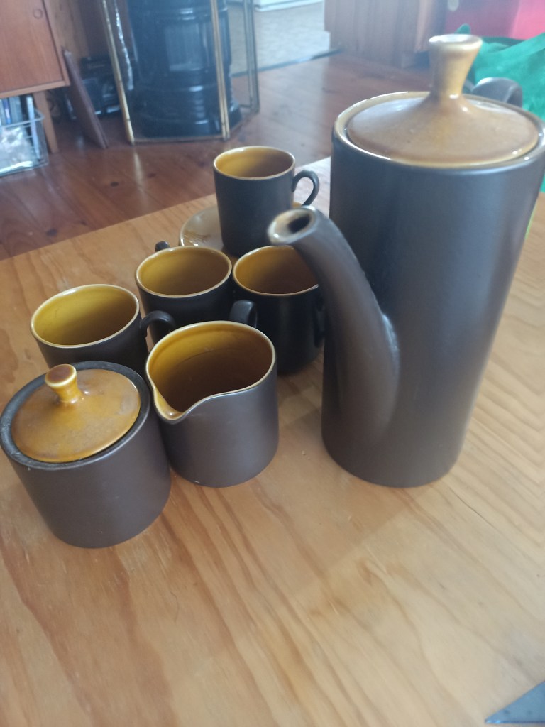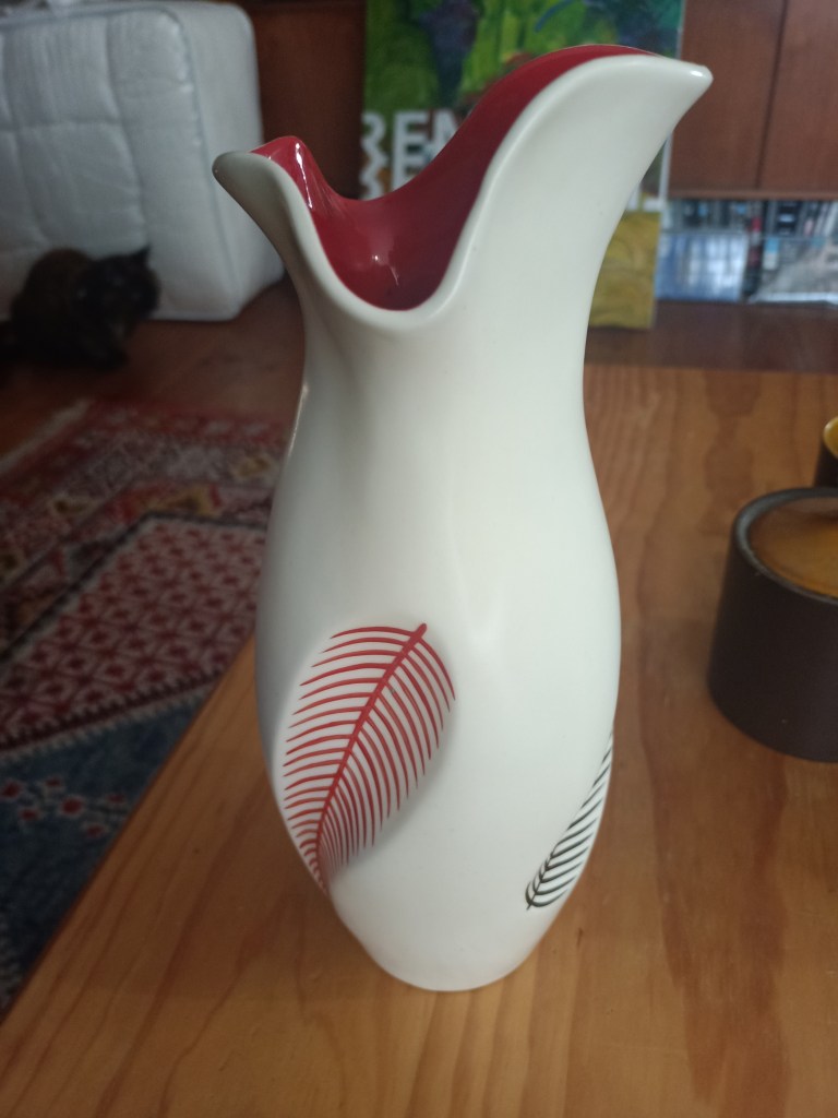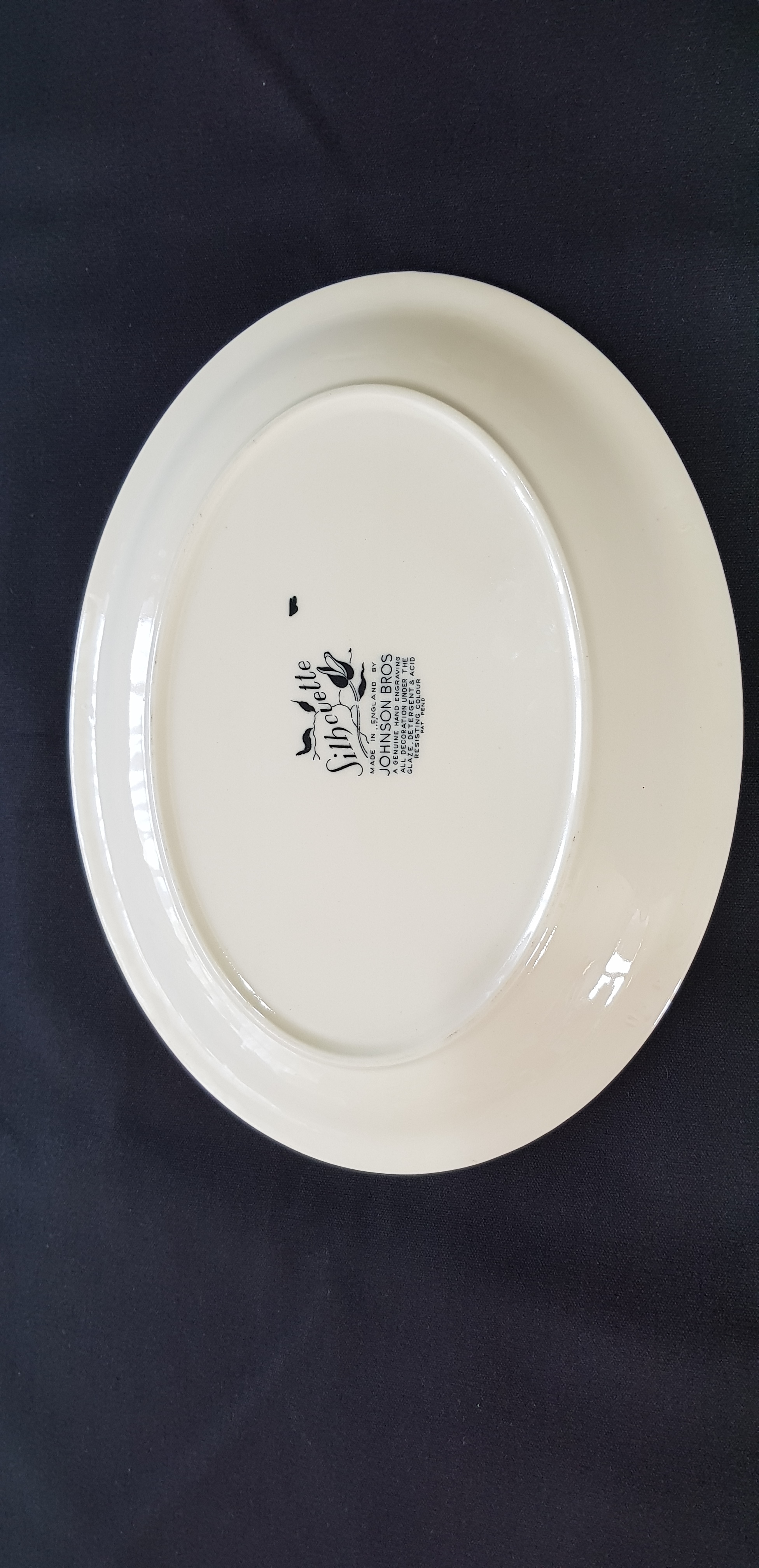 We recently picked up this very unusual platter from a Sunday market. It’s from the Johnson Brothers ‘Silhouette’ range, but you won’t find it on the Johnson Bros site…in fact there’s very little about it. That’s not surprising as it has a chequered history. The design was ‘adapted’ (let’s be realistic… stolen) from a fabric pattern by Australian artist Nance McKenzie, a blatant misuse of her intellectual property.